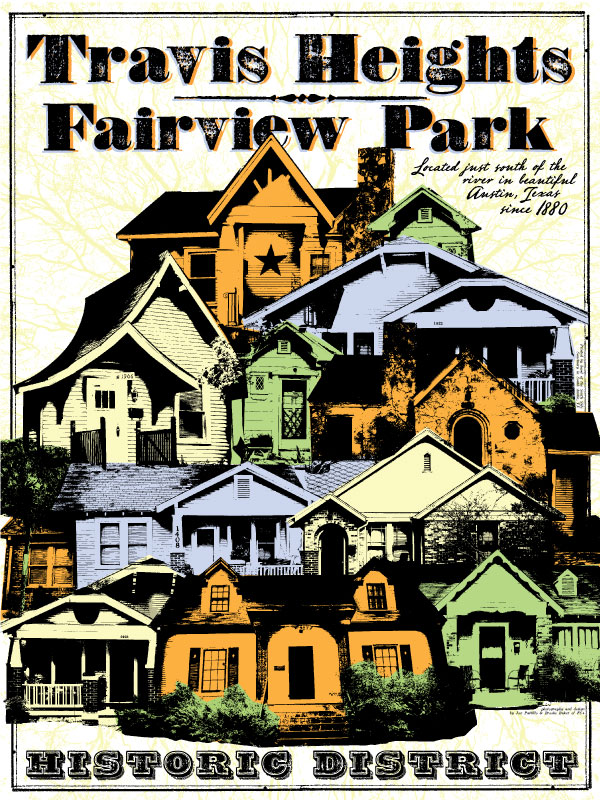 Colorful hand-made serigraph prints ($45, 20″ x 26″) by Jon Pattillo of Fat Caddy Plus celebrate the sweetness of our historic neighborhood. Donate to our cause and decorate at the same time. E-mail Historic Travis Heights and we will get one or more of these signed, numbered works of art to you.